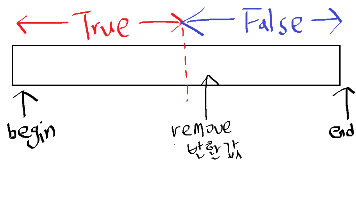 따라서, "remove_if" 알고리즘은 구간 내 분할 지점을 가리키는 반복자를 반환하며, 이를 통해 "erase" 알고리즘으로 합치하지 않는 항목들을 삭제할 수 있습니다.