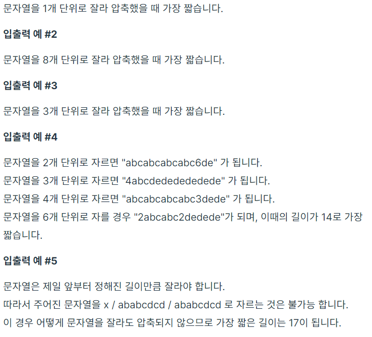 * 주의 : 압축 단위가 전체 문자열 길이와 나누어 떨어지지 않으면, 압축하고 남은 나머지 문자열 길이를 생각!
