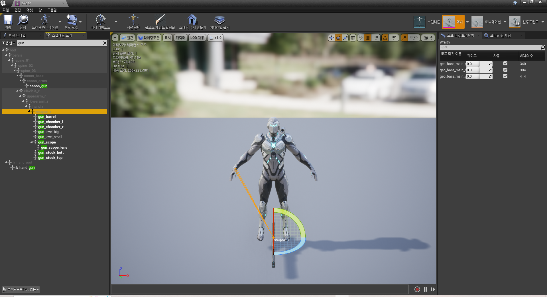 2. Character Mesh 중 Gun Mesh에 해당하는 Bone을 숨깁니다.
