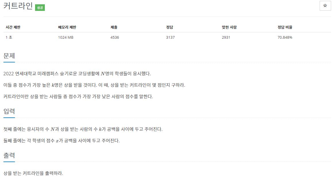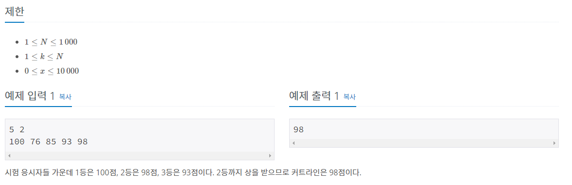 STL이 제공하는 정렬 알고리즘을 통해 커트라인 바로 위 점수를 출력하는 문제