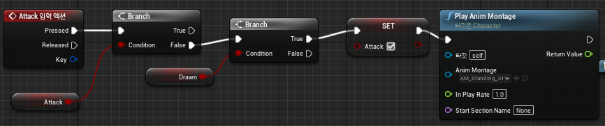 2. "Drawn" 이 True 일 때, 즉 무장 상태 일 때 "bAttack"을 True로 설정