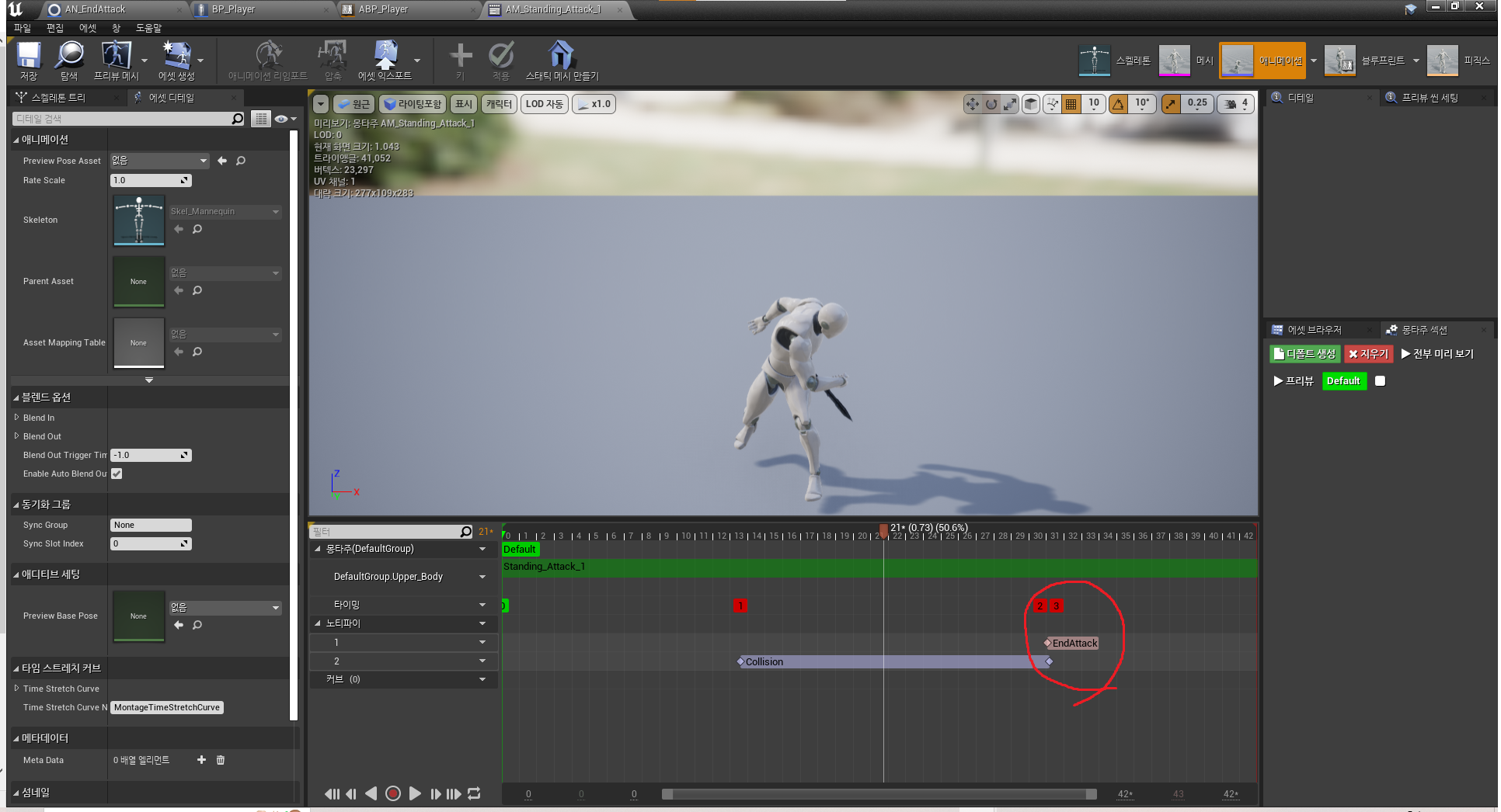 * 앞서 살펴봤듯이, 공격 작업이 끝나는 시점에 "Anim Notify"를 추가해야겠죠!