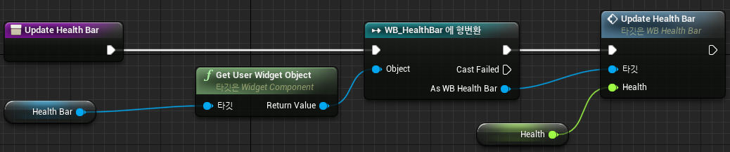 2. "Widget Component" 유형의 변수를 생성하고 형 변환과 함께 WBP_HealthBar를 가져옵니다.