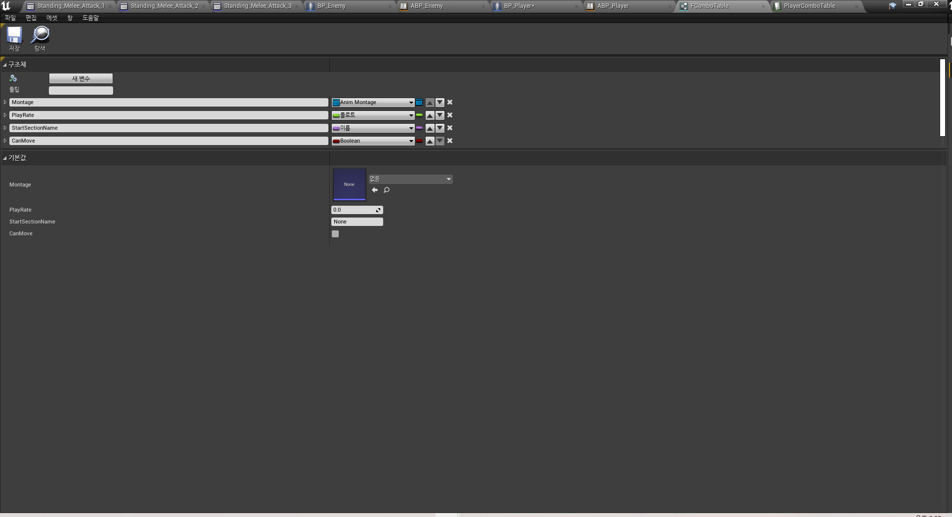 FCombo Table에서 생성한 구조체 형식들을 통해 "Attack 1 ~ 3" 애니메이션의 정보들을 담고 있습니다!