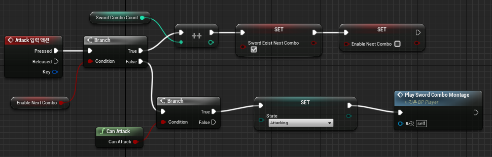 앞서 Attack 입력 이벤트 구현에서 "Enable Next Combo" 애님 노티파이 스테이트 구간에 후속 입력이 추가로 들어오면 "Sword Exist Next Combo" 변수를 "True"로 변경했었죠? 따라서, 애님 몽타주의 "End Attack" 애님 노티파이 스테이트 구간에서 "Sword Exist Next Combo" 변수가 True 인 채로 진입하면 다음 애님 몽타주를 재생함으로써 콤보 어택을 화면에 그려냅니다!