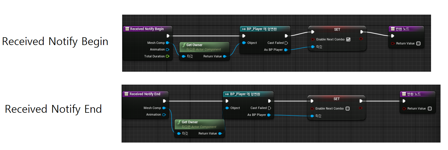 간단하게, BP_Player 객체의 "Enable Next Combo" 변수를 "True"로 설정합니다.