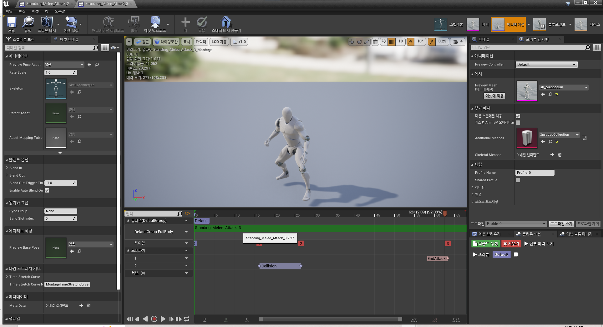 Attack 1을 제외한 나머지 공격 애님 몽타주 들은 이동을 제한하고 플레이되는 "Full Body" 슬롯에 해당되기 때문에 Animation 블루프린트에서 구현한 "Layerd Blend per Bone"에 함께 블렌딩 되도록 Default 슬롯을 "Full Body"로 설정해주면 정상적으로 "Combo Attack"을 구현할 수 있습니다!
