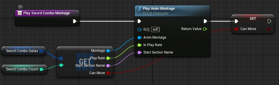 Combo Attack 애니메이션 애셋을 재생할 동안 Character의 움직임을 제한하기 위해 Sword Combo Datas 배열이 담고 있는 구조체의 원소 중 "CanMove"변수를 캐릭터 블루프린트에서 별도로 생성한 동명의 변수 값으로 설정해줍니다.