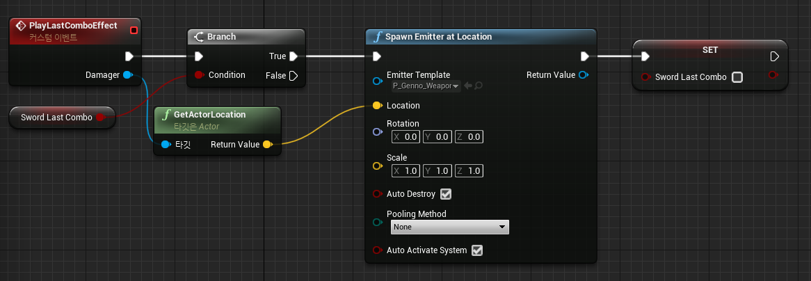 Sword 관련 이벤트 중 "Sword Last Combo" 변수가 참 일 때 실행되는 커스텀 이벤트입니다. 간단하게 말하자면, 콤보 어택 중 마지막 애님 몽타주가 플레이됨과 동시에 호출되는 이벤트입니다.