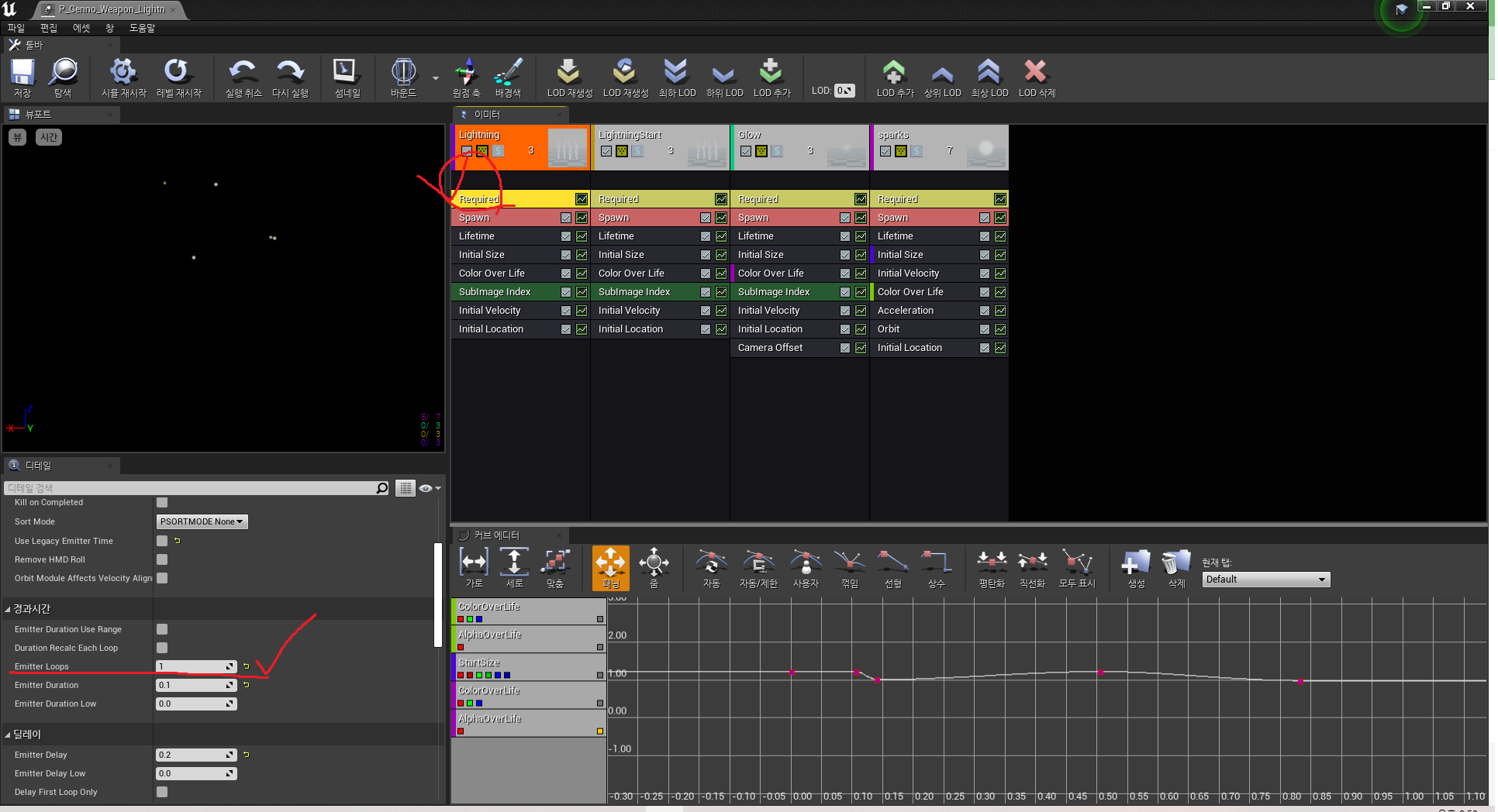 2. Required -> Duration -> Emitter Loops를 1로 설정
