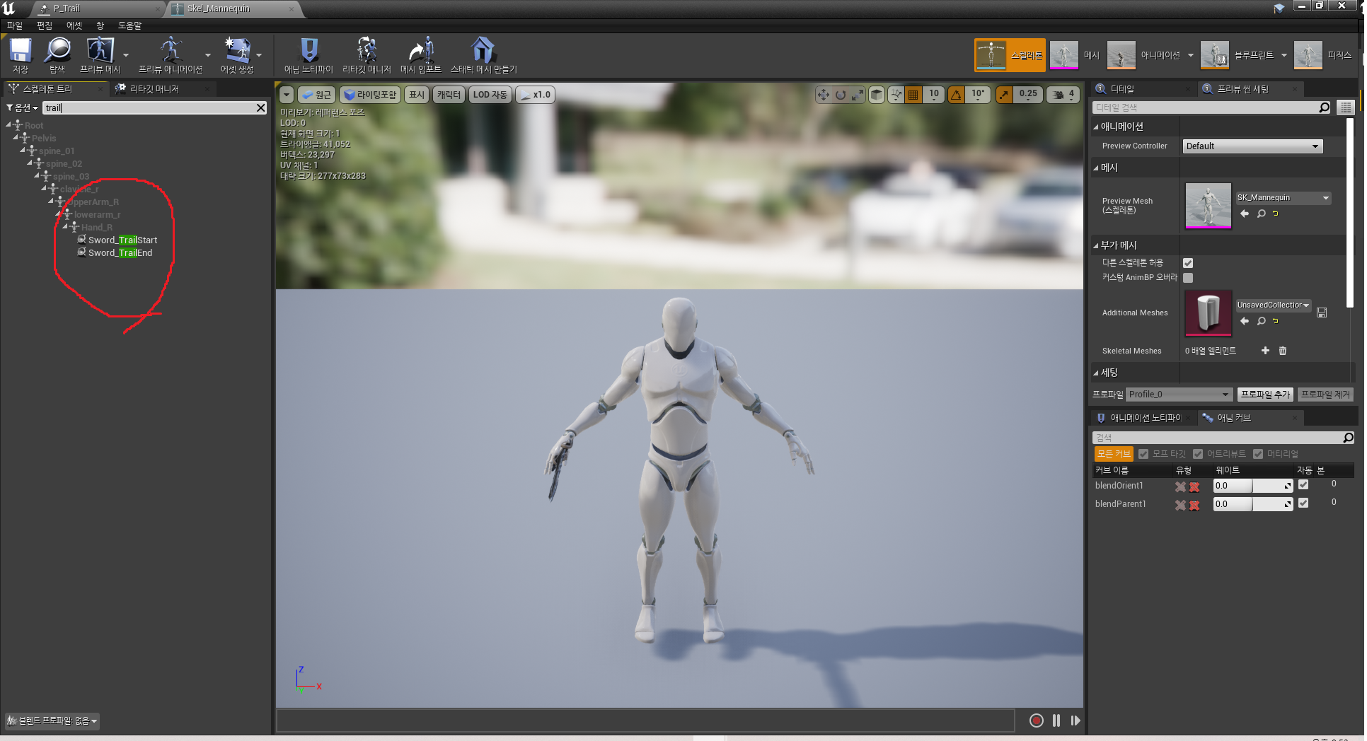 1. Hand_R 밑에 Trail Start 소켓과 Trail End 소켓 추가합니다.
