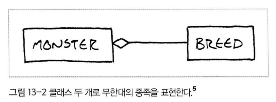게임의 몬스터들을 "Monster" 클래스로 묶는것과 더불어 "Breed(종족)"클래스로 한번 더 묶어보겠습니다. 하지만, 우리는 Monster -> Breed -> Dragon 순서의 상속 계층을 형성하기보다, "Monster" < -> "Breed"로 Dragon 몬스터를 "Monster" 클래스로부터 생성된 인스턴스들 중 한 개로 생각해보죠! 정리하자면, Monster 클래스의 인스턴스들은 "Dragon", "Troll", "Skull" 등 각각 다른 특성을 갖고 있으며, 공통된 특성들은 "Breed"라는 타입 객체 클래스로부터 가져오게 되는겁니다!