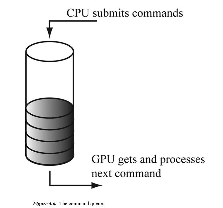 GPU에는 명령 대기열이 있습니다. CPU는 그리기 명령어들이 담긴 명령 목록을 Direct3D API를 통해 그 대기열에 제출합니다. 하지만, CPU가 명령들을 명령 대기열에 제출했다고 해도, GPU는 그 명령들을 즉시 실행하지 않습니다! 여기서 우리가 알아야 할 점은 게임 같은 고성능 응용 프로그램의 목표는 가용 하드웨어 자원을 최대한 활용 할 수 있도록 CPU와 GPU의 상호작용을 원할하게 하는 것입니다.