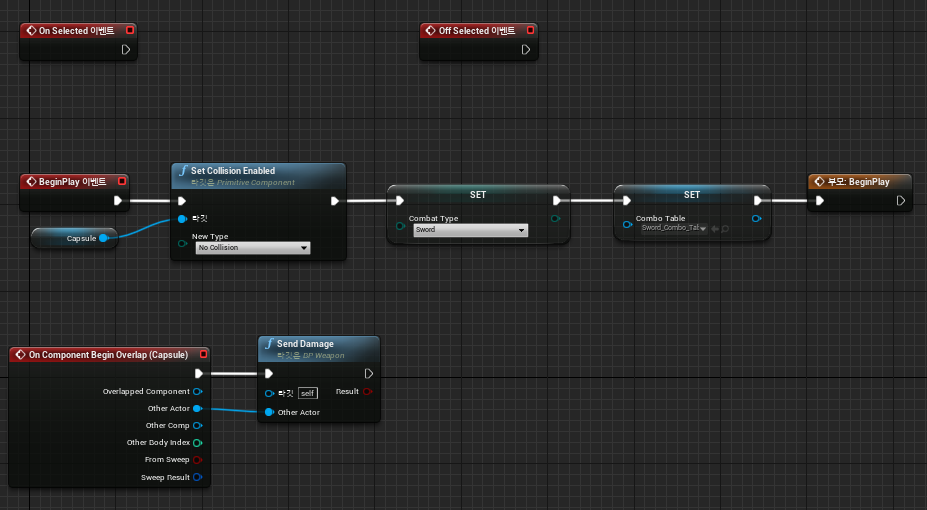 2. Begin Overlap BP_Weapon의 Send Damage 함수 화면On Component Begin Overlap(충돌) 이벤트는 간단하게 "BP_Weapon"에서 미리 구현한 Send Damage 함수를 호출하도록 합니다.