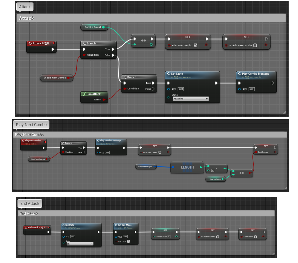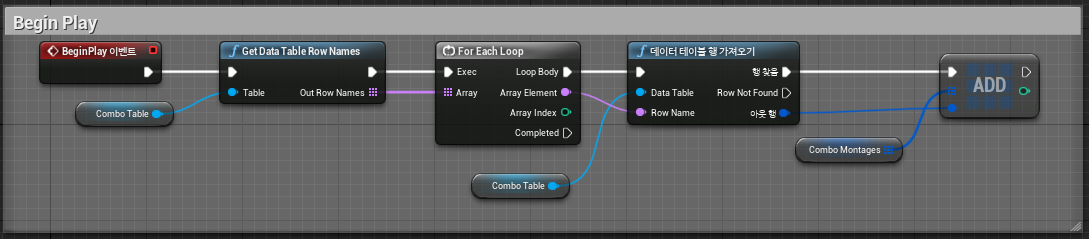 1. Combo Table : Combo 애님 몽타주 정보를 담고 있는 데이터 테이블 2. Combo Montages : Combo Table로부터 가져온 몽타주 정보를 담고 있는 구조체 3. Exist Next Combo 4. Enable Next Combo 5. Last Combo