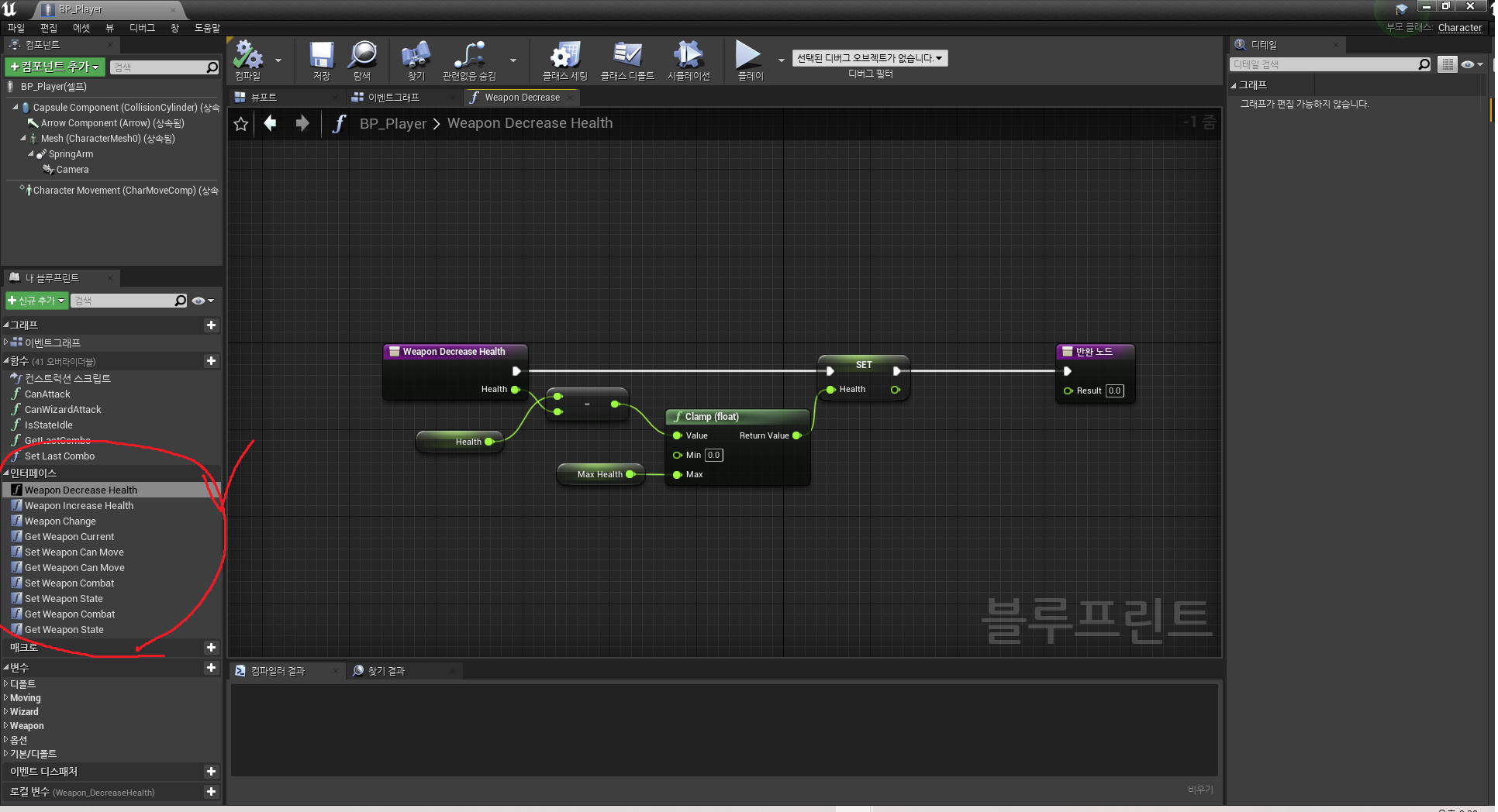 BP_Player의 이벤트 그래프 "인터페이스" 항목의 함수들