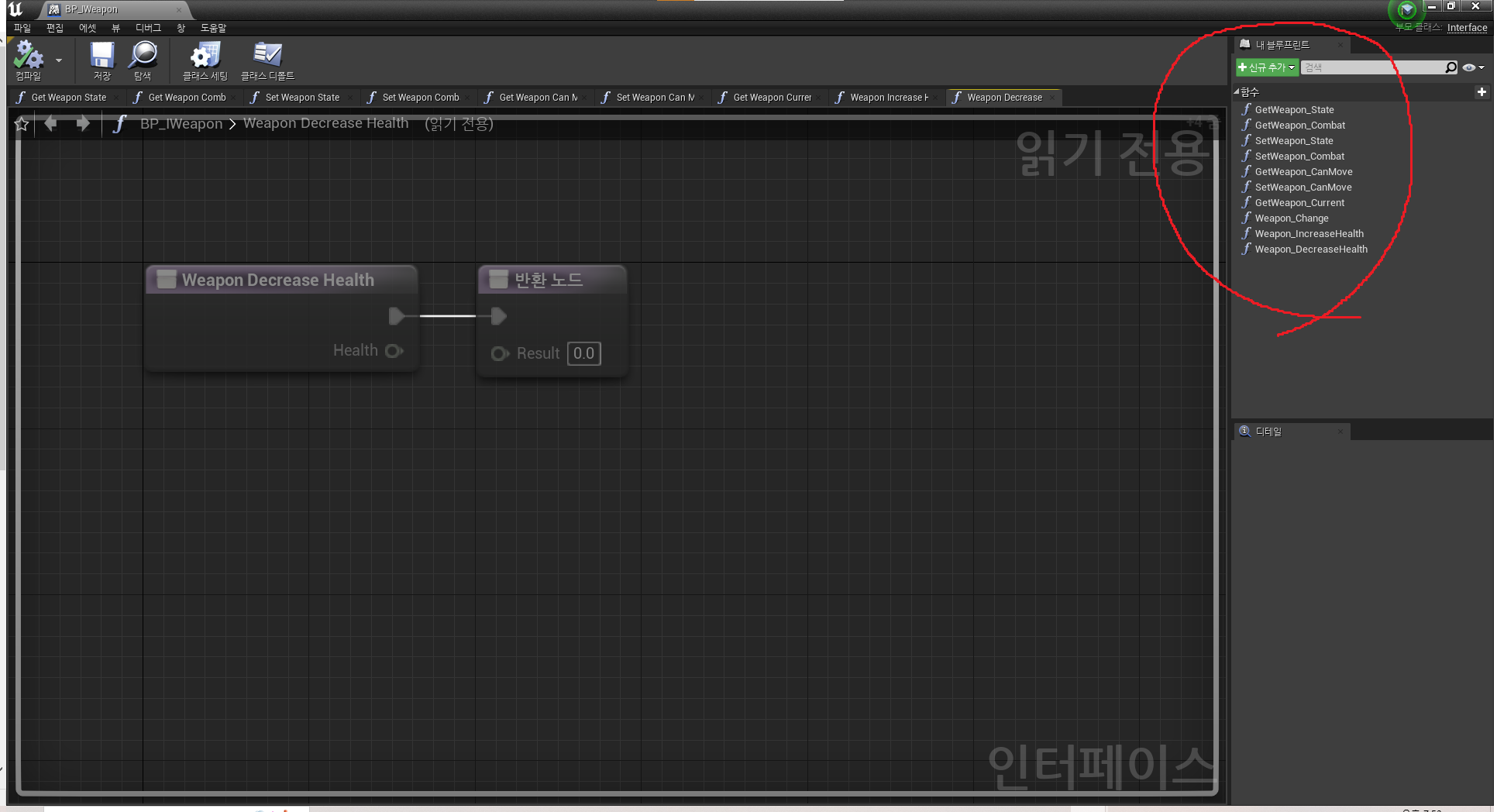 BPI_Weapon에서 생성한 인터페이스 함수들의 목록은 블루프린트 에디터 왼쪽 하단에서 발견할 수 있습니다.