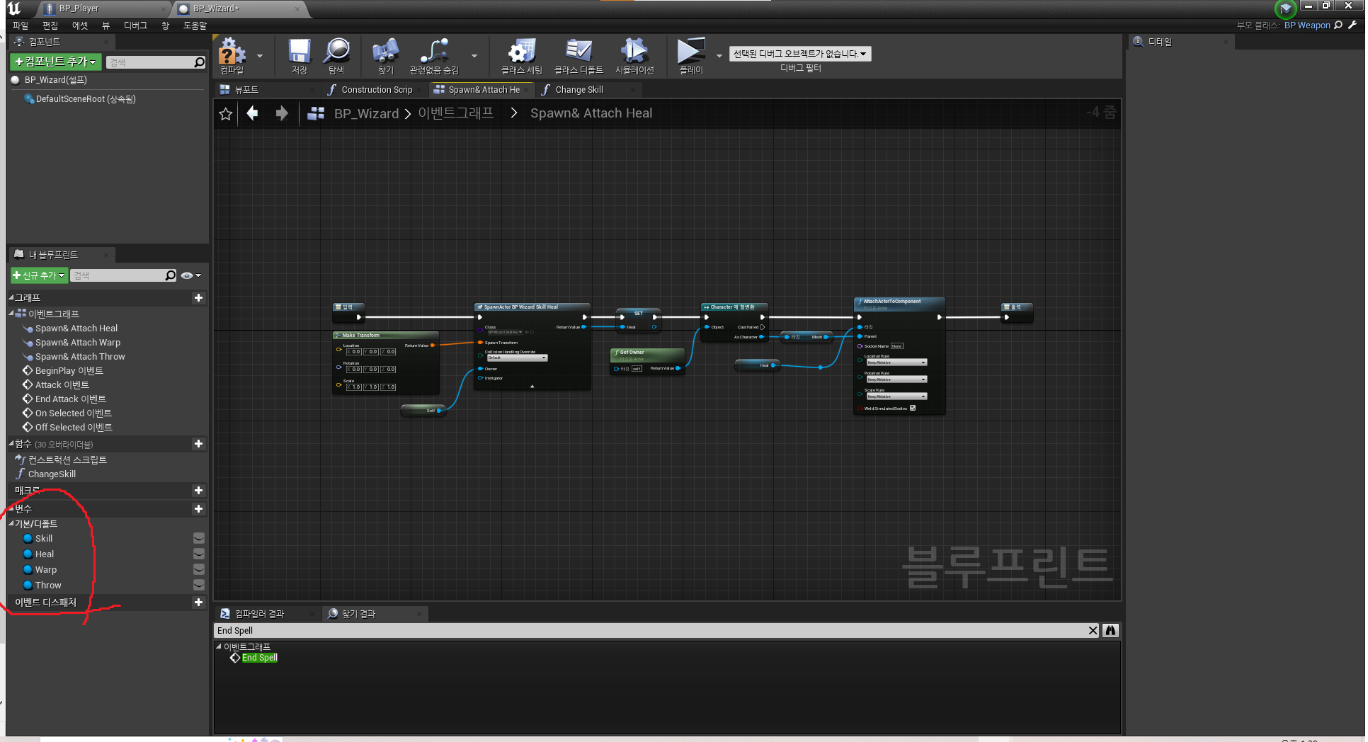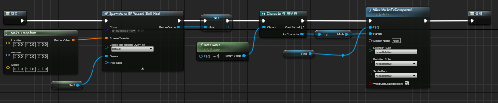 3. BeginPlay 이벤트 BP_Wizard의 BeginPlay에 연결된 Spawn&Attack Heal 노드 그룹 내부 화면먼저, Combat Type 상태 변경과 함께, Skill( Heal, Warp, Throw(투적 마법)) 별 필요한 Actor를 Spawn 그리고 Attach 합니다.