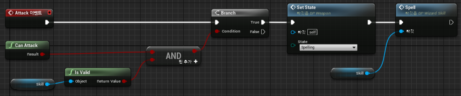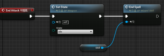 4. Attack 입력 이벤트 구현 BP_Wizard 이벤트 그래프 "Attack" 이벤트 구현BP_Wizard의 이벤트 그래프 중 "EndAttack" 이벤트 구현"Attack" 이벤트는 "BP_Weapon"의 함수로 구현이 없는 순수 가상 메서드로 취급해봅시다. 따라서, "BP_Wizard"에서 오버라이딩 합니다ㅎㅎ. "BPI_Weapon"에서 제공하고 "BP_Player"에서 정의한 "SetState"를 호출해서 상태 변경을 진행합니다. 더불어, "BP_WizardSkill"에서 선언한 "Spell"을 호출합니다.