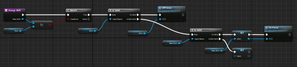 "OnFocus"이벤트와 "OffFocus"이벤트는 "BP_WizardSkill"에서 선언한 커스텀 이벤트로 Skill 변경을 위해 필요한 커스텀 이벤트입니다. 각각 새로운 Wizard Skill이 정해질 경우 현재 Skill을 "OffFocus"하고, 새로운 Wizard Skill을 "OnFocus"합니다.