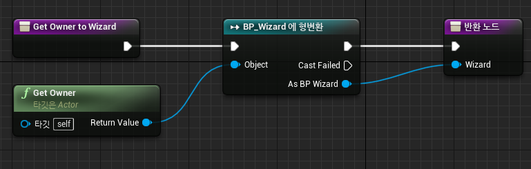 간단합니다. Owner(BP_Wizard)를 얻어오기 위한 함수입니다. "BP_WizardSkill"은 "BP_Wizard"와 하위 스킬들과 연결하기 위한 클래스로, 하위 클래스들의 상세 구현을 위해 비교적 더 필요한 "BP_Wizard"를 쉽게 얻어올 수 있도록 함수를 정의합니다. (굳이 BP_WizardSkill이 필요한가 싶지만, 일단 진행해보겠습니다...)