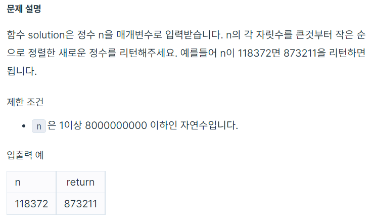 Programmers 알고리즘 문제 풀이, Level 1_정수 내림차순 정렬