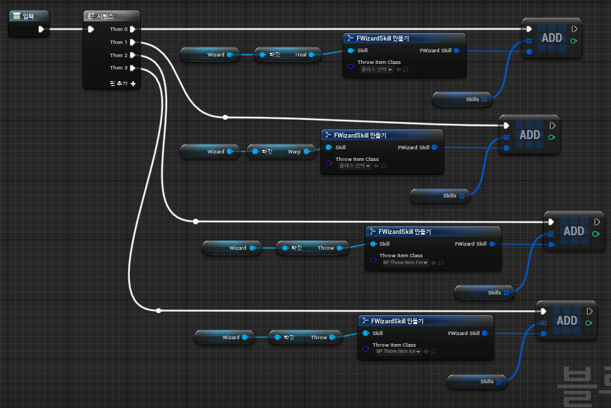 BP_WizardSkill을 상속하는 BP_WizardSkill_Heal, BP_WizardSkill_Warp, 그리고 BP_WizardSkill_Throw 중 하나를 담도록 합니다.