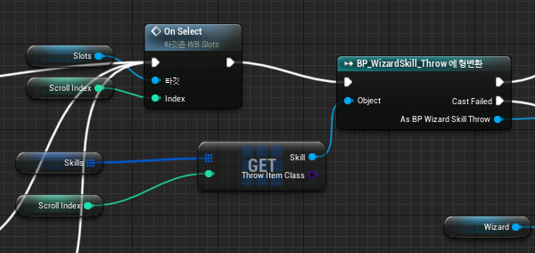 On Select 이벤트 호출은 추후에 UI 생성 후에 다루겠습니다. 최종 선택된 Scroll Index 값을 갖고 "Skills(Wizard Skill들을 담고 있는 배열)"에 접근하여 특정 Index 값의 항목이 "BP_WizardSkill_Throw"라면 추가적인 세부 스킬 선택이 필요합니다! 따라서, "BP_WizardSkill_Throw"가 맞다면, "BP_ThrowItem_Fireball"과 "BP_ThrowItem_Iceball" 중 하나를 선택해 "BP_WizardSkill_Throw"의 "Throw Item"을 무엇으로 할지 결정하겠죠.