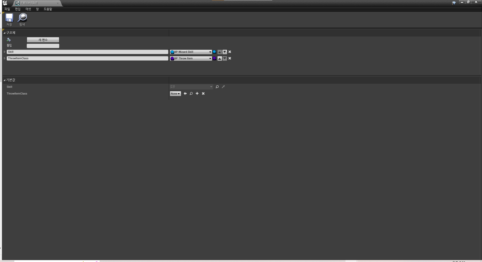 "F_WizardSkill" 구조체에 정보를 담아서 배열을 생성합니다. 이때, ThrowItem 클래스는 Skill 이 "BP_WizardSkill_Throw"일 때만 가능하므로 그 외 Skill들은 Throw Item 클래스를 별도로 지정하지 않습니다.