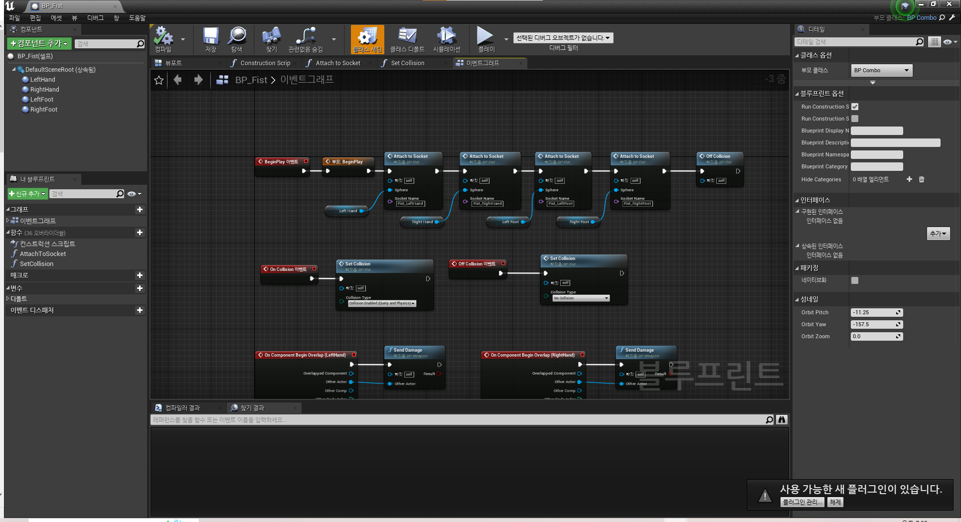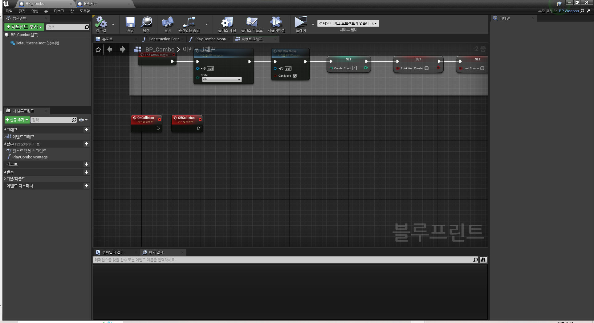 BP_Combo에서 선언하고 BP_Fist에서 상세 구현한 OnCollision + OffCollision 커스텀 이벤트