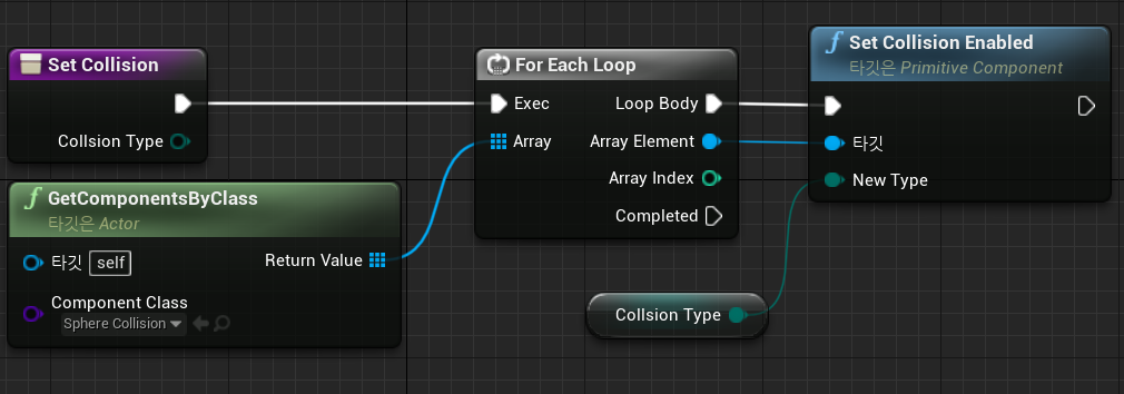 간단하게 BP_Fist에서 선언한 SetCollision 함수를 호출하고, Collision 타입을 전달합니다.