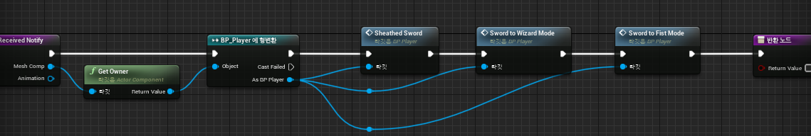 Sword 공격 모드를 끝내고 BP_Sword를 Weapon Holster 소켓에 다시 집어넣고 호출되는 해당 노티파이는 Sword -> Fist 공격 모드 간 전환을 위해 추가 구현이 필요하죠!
