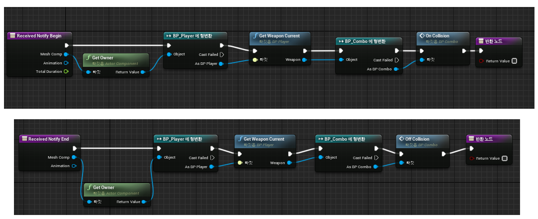 BP_Combo의 하위 클래스, 즉 BP_Sword + BP_Fist 만 Collision 관련 노티파이 스테이트를 필요로 하기 때문에 현재 Weapon을 BP_Combo로 캐스팅하여 성공하면 Collision 관련 함수를 호출해줍니다. 당연하게도, BP_Wizard 같은 NoCombo 공격 방식은 별도의 호출이 필요 없습니다.