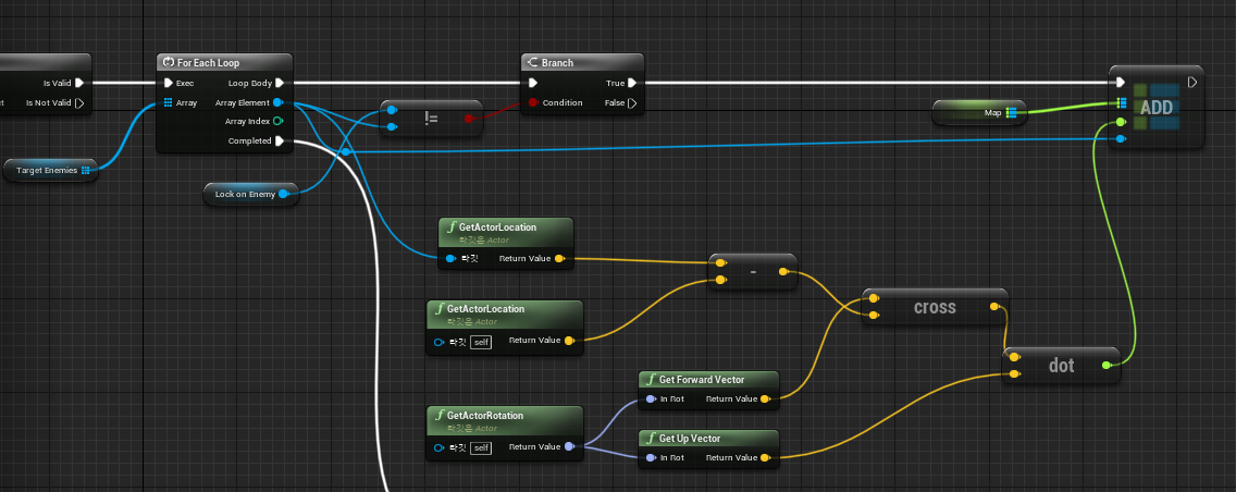 - Target Enemy 객체(Key) + Player와 해당 Target Enemy 객체 간의 거리(Value)를 Pair로 "map 컨테이너"를 생성합니다. 이때 중요한 점은 "내적(Dot Product)" + "외적(Cross Product)"의 활용입니다!