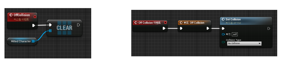 - OffCollision 호출은 Weapon의 공격이 모두 끝난 시점에 호출되는 BP_Combo에서 제공하는 이벤트입니다.