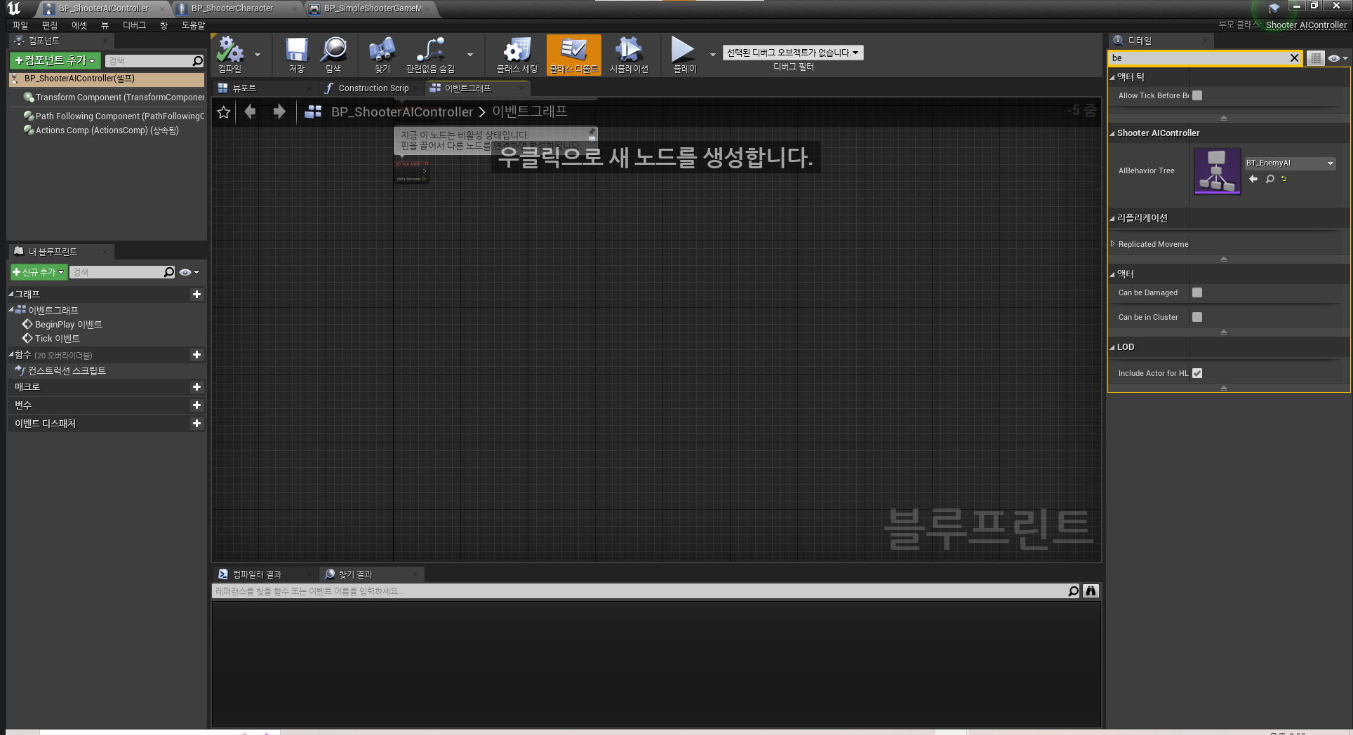 - 앞서 C++에서 노출시킨 AIBehaviorTree 포인터 변수를 에디터에서 설정해줍니다.