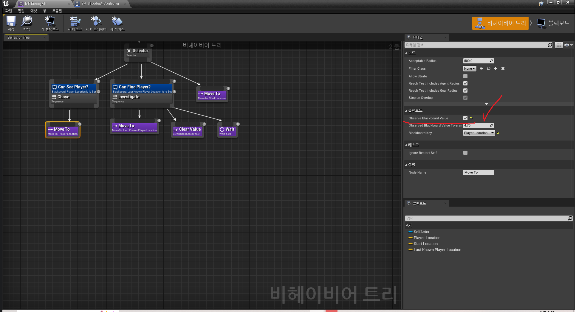 - *Observe Blackboard Value : 블랙보드 키 값을 지속적으로 관찰할것인지 여부를 확인합니다.