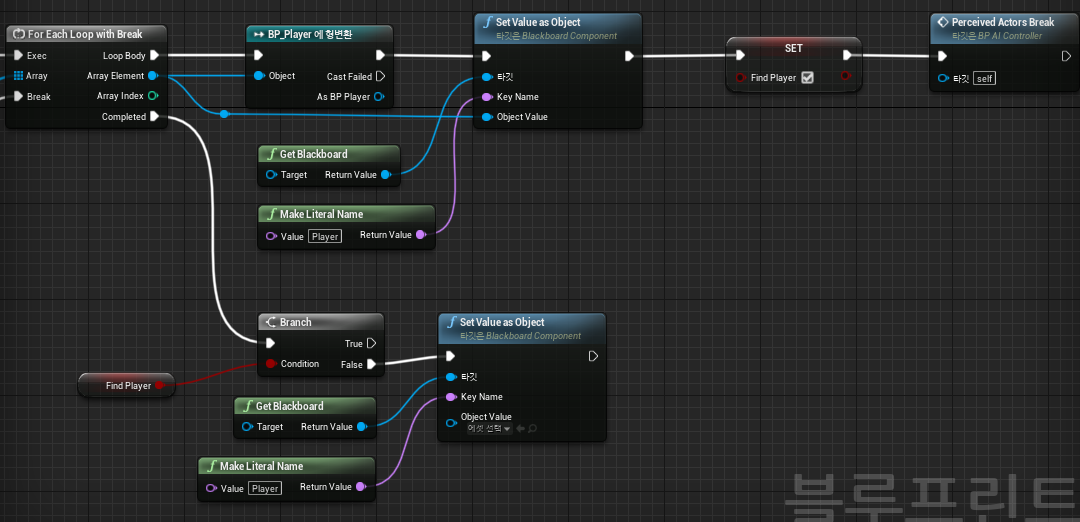 - Get Currently Perceived Actors가 반환하는 배열 항목 중 "BP_Player"에 캐스팅되는 값들을 Key값에 설정합니다.