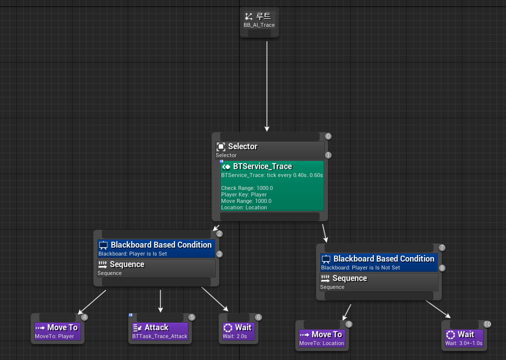 - Selector + BTService_Trace: Player 키 + Location 키 설정 여부를 체크