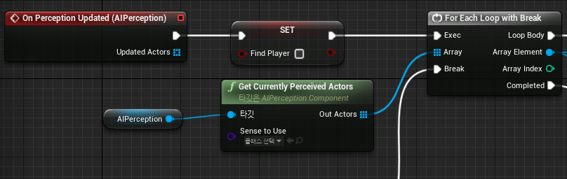 - AIPerception::Get Currently Perceived Actors : AIPerception 컴포넌트를 통해 현재 인식되는 Actor 배열 반환