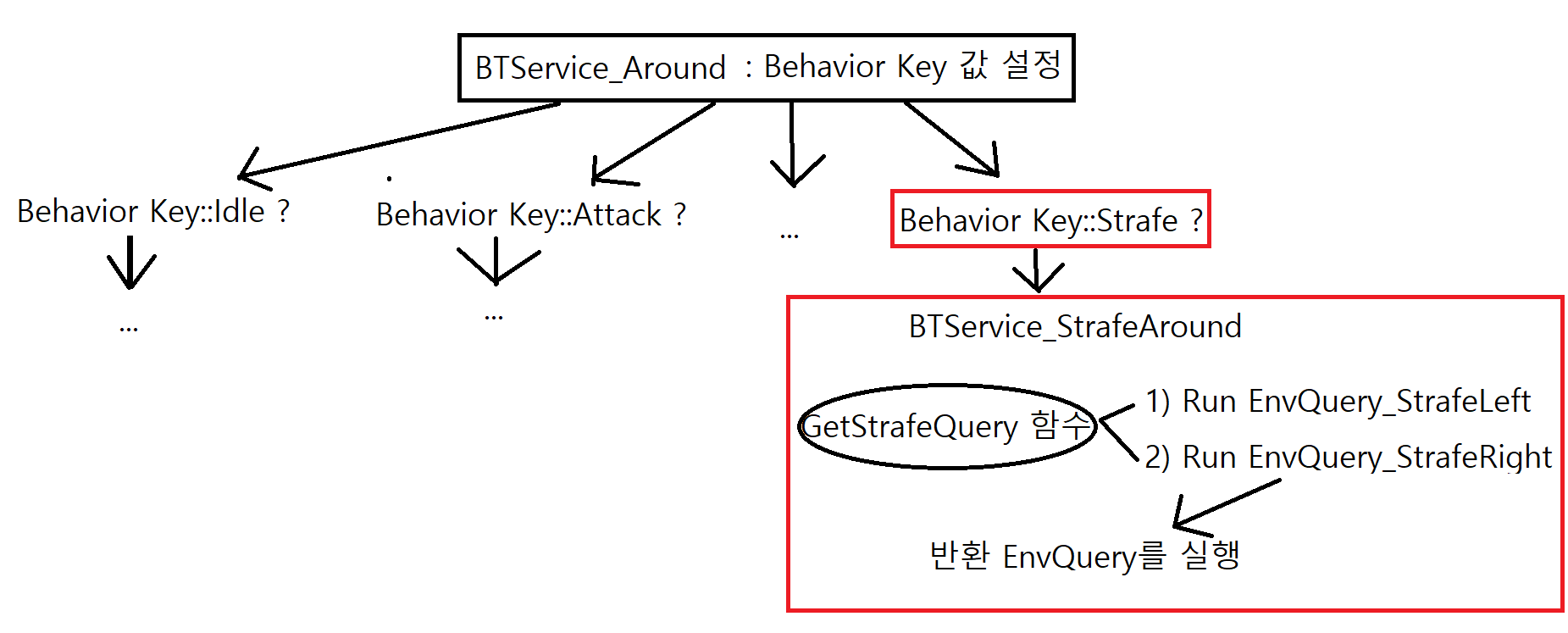 - BTService_StrafeAround::GetStrafeQuery는 AI : Player의 거리에 따라서 EnvQuery_Left or Right 수행 여부 결정