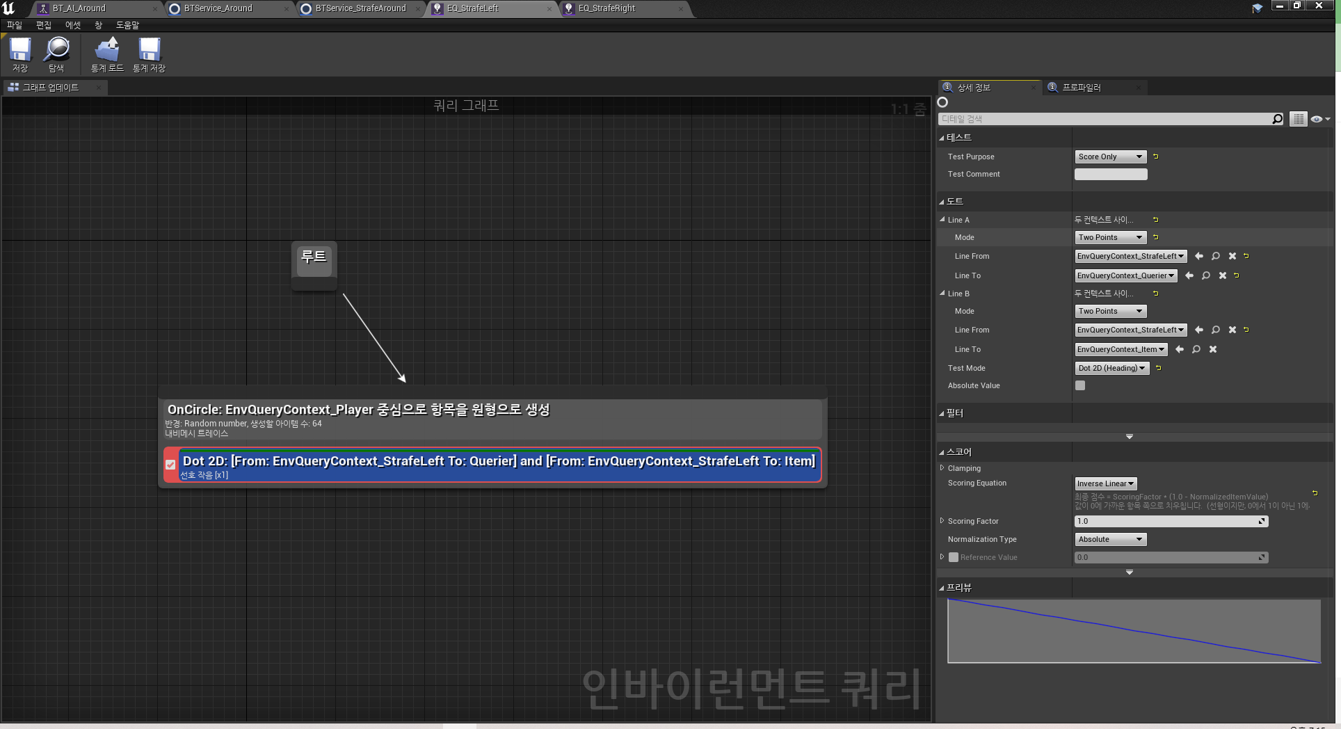 - AI 기준 오른쪽 방향벡터와 AI -> Player 벡터의 내적을 통해 "Strafe" 방향을 결정하고 해당 EnvQuery를 반환합니다.