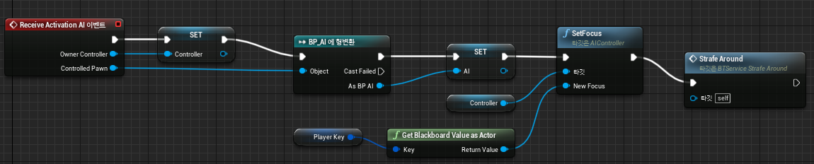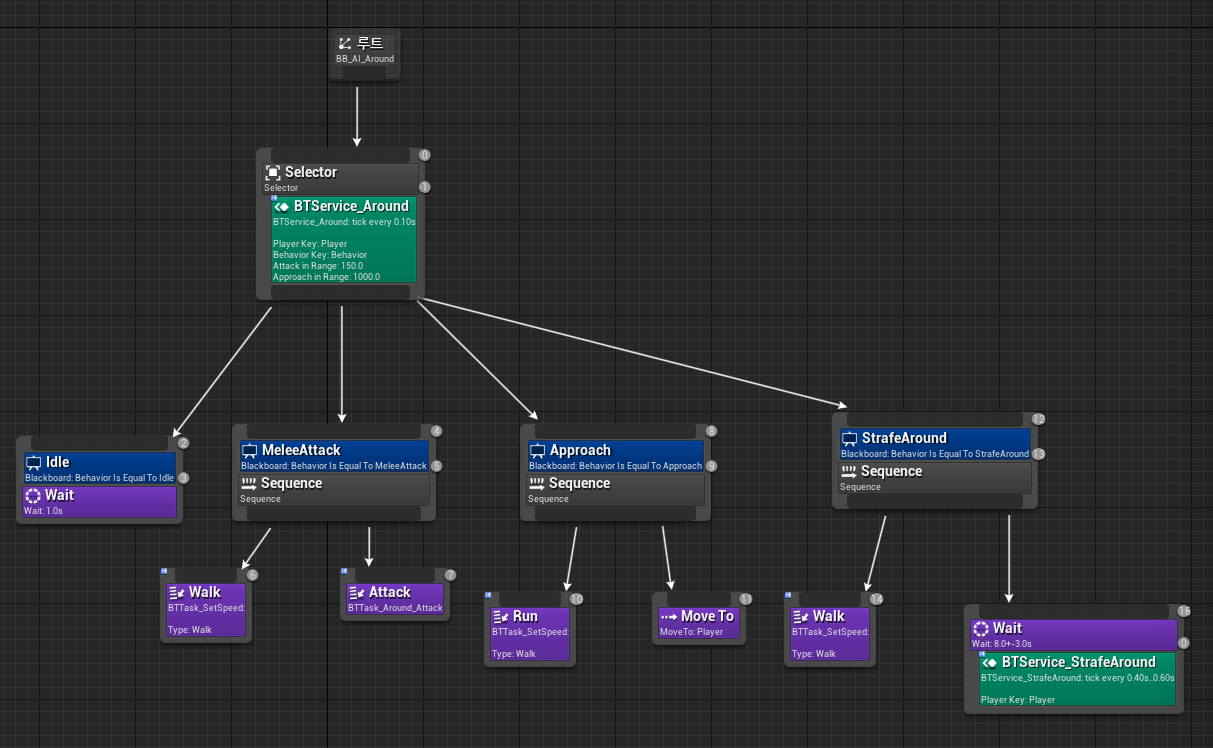 - AI의 공격 범위에 Player가 속하지 않는 경우 Behavior Key 값은 StrafeAround로 설정됩니다.