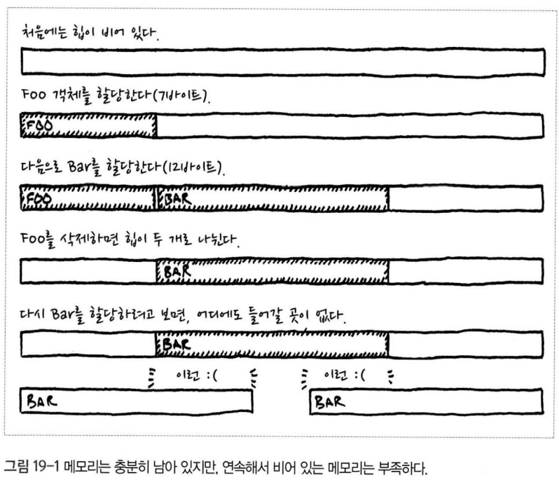 - 메모리 단편화란, 힙에 사용 가능한 공간이 여유로운 크기로 뭉쳐 있지 않고, 작게 조각나 있는 상태를 의미합니다