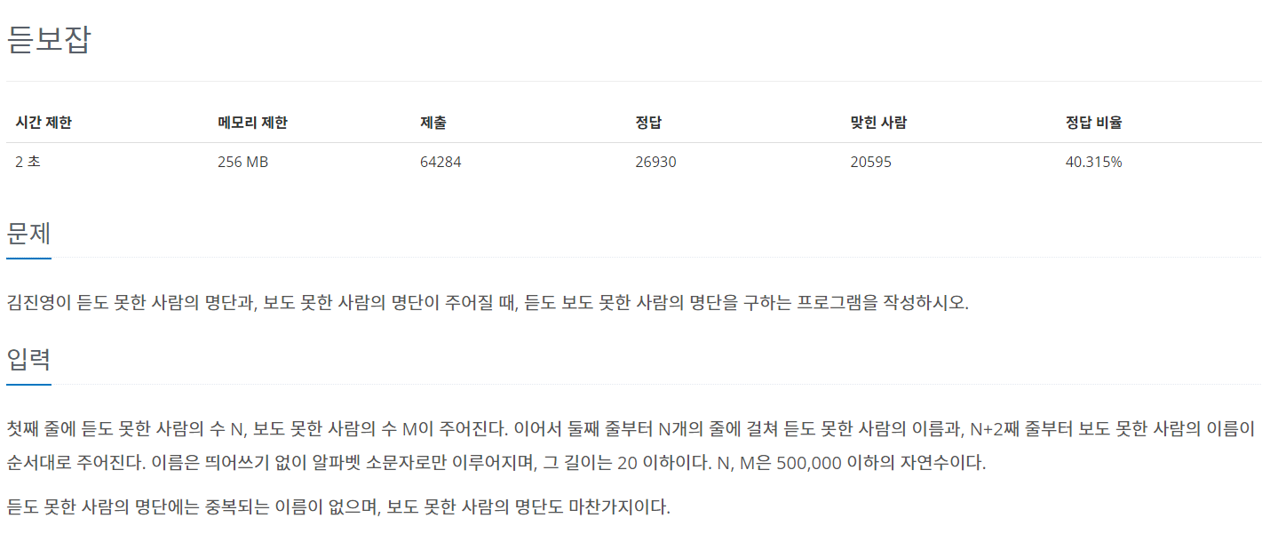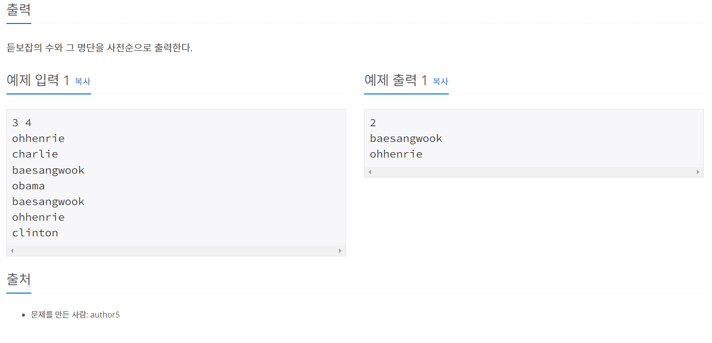 BOJ 알고리즘 문제 풀이, 1764_듣보잡, Set 문제