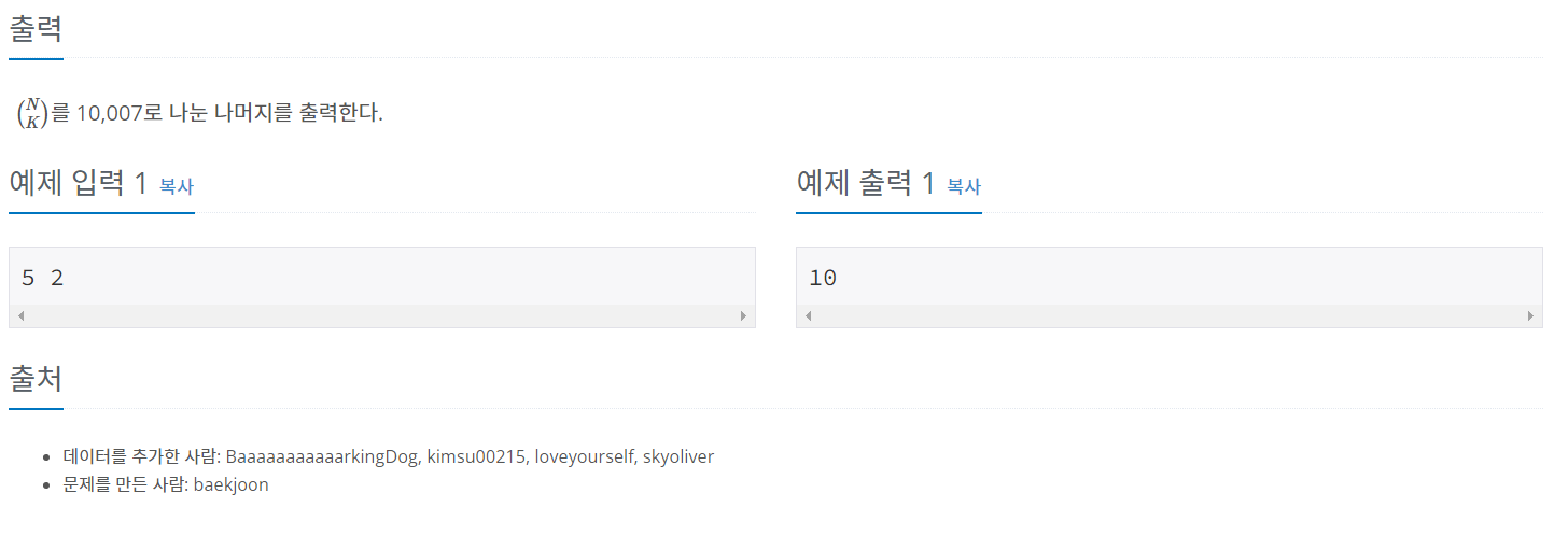 C(N,K) % 10007 결과 출력