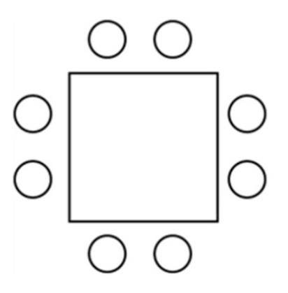 문제) 위 그림과 같은 정사각형 모양의 탁자에 8명이 둘러앉는 방법의 수는? (단, 회전하여 일치하는 경우는 같은 경우)