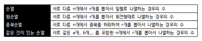 - 서로 다른 N개의 항목들 중에서 R개를 선택해 일렬로 나열한 것. nPr(Permutation)로 표현합니다.