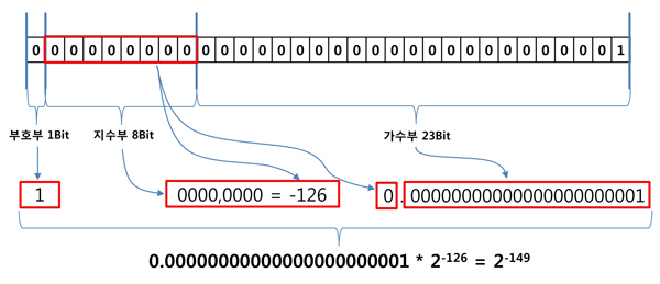가장 작은 수 = 0.0000...0001 X 2^-126 (O) -> 유효 숫자의 정수부 0, 가수부 마지막만 1, 지수부 -126