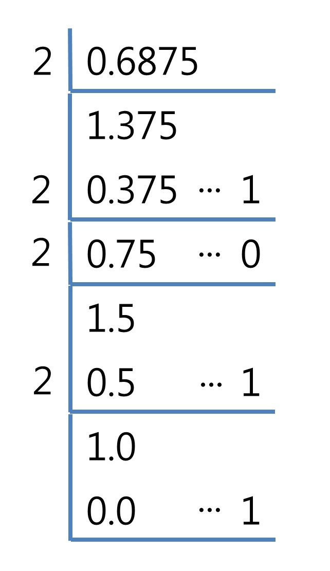 - 소수, 즉 "-9.6875" 중 6875는 우리가 아는 2진 변환을 반대로 적용하면 됩니다.